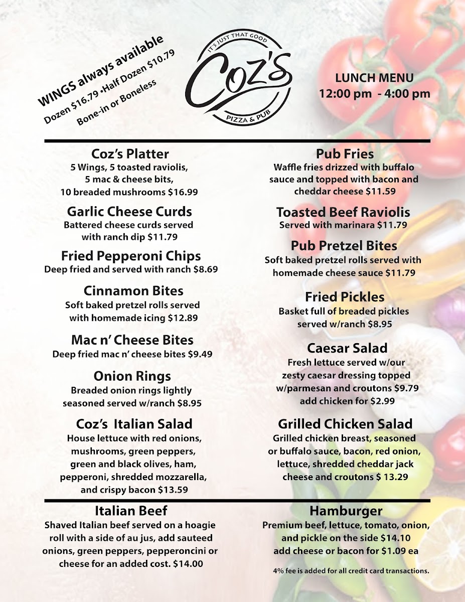 At COZ'S, creativity meets classic flavors, making it an ideal spot for those eager for a personalized dining experience. The highlight of their menu is undeniably the Build Your Own Pizza. Available in 14” and 16” sizes, you’re invited to unleash your inner chef by selecting from a plethora of toppings. Meats like sausage, pepperoni, and even fried pepperoni join a colorful array of veggies including mushrooms, green peppers, and jalapenos. It’s pizza crafted to suit your palate—one slice at a time.