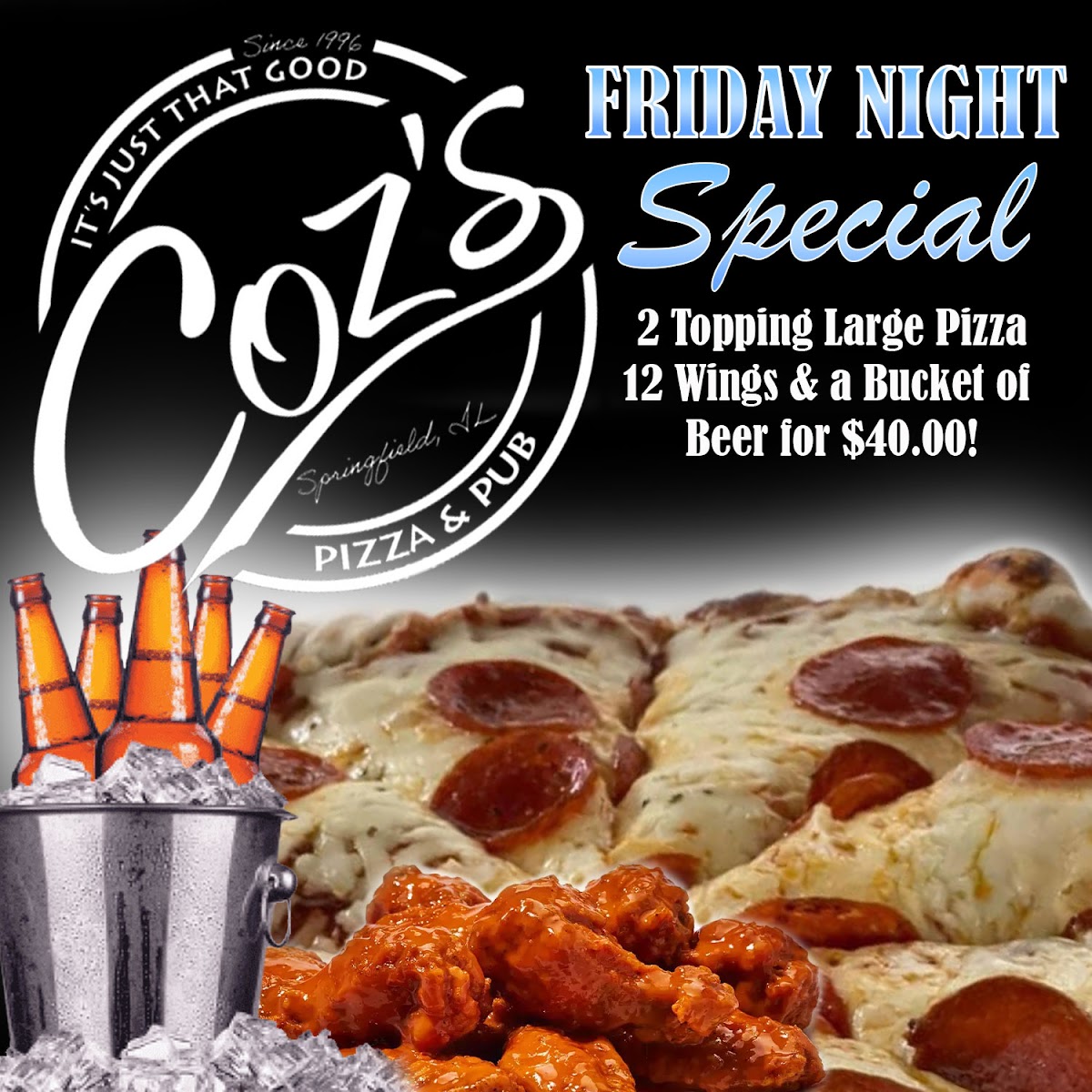 COZ'S PIZZA & PUB, located at 4441 Ash Grove Dr in Springfield, IL, is a beloved local eatery famed for its customizable pizzas and vibrant atmosphere. Guests can craft their own 14" or 16" pizzas, selecting from a myriad of toppings—from savory meats like pepperoni and grilled chicken to fresh veggies such as mushrooms and jalapenos. The menu also features tempting specialties like the Italian Double Decker pizza and flavorful salads. Diners rave about the lively patio, friendly staff, and a selection of cold beers. With its family-friendly vibe and hearty portions, COZ'S PIZZA & PUB is a must-visit for pizza lovers.